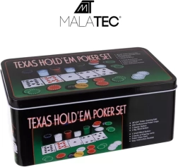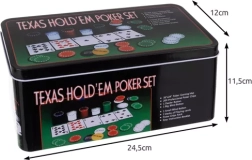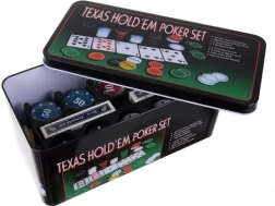 • Inhoud van de set: blikken metalen doos, groen vilt 92 × 58 cm, 200 fiches (5–100), 2 × kaartspel, fiches Dealer / Small Blind / Big Blind, ficherek