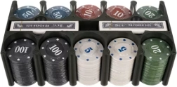 Het praktische rek houdt fiches en kaarten op hun plaats. Gemakkelijke bediening voor spelers en “dealer” en orde tijdens het hele spel.