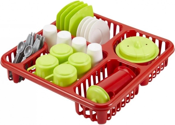 Een leuke en praktische set voor de kinderkeuken – groot afdruiprek met servies bevat alles wat kleine koks nodig hebben. Kinderen oefenen hun fijne motoriek en genieten van realistisch rollenspel in het huishouden dankzij bekers, bestek, borden en potten met deksels.