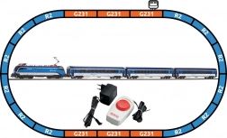 • Inhoud van de set: elektrische ČD Taurus-locomotief (1×), ČD-rijtuig 2e klas (3×), gebogen R2-rails met bedding (12×), rechte G231-rails met bedding (5× + 1× met voedingsaansluiting), voedingsklem met bedding, basis analoge regelaar met voeding.