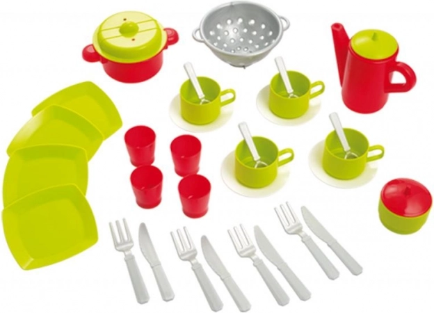 Praktische en leuke set van een theeservies en keukengerei voor kinderen, ideaal om mee te spelen en vaardigheden te ontwikkelen. De set bevat een complete uitrusting die je kind nodig heeft voor zijn of haar eigen theekransje.