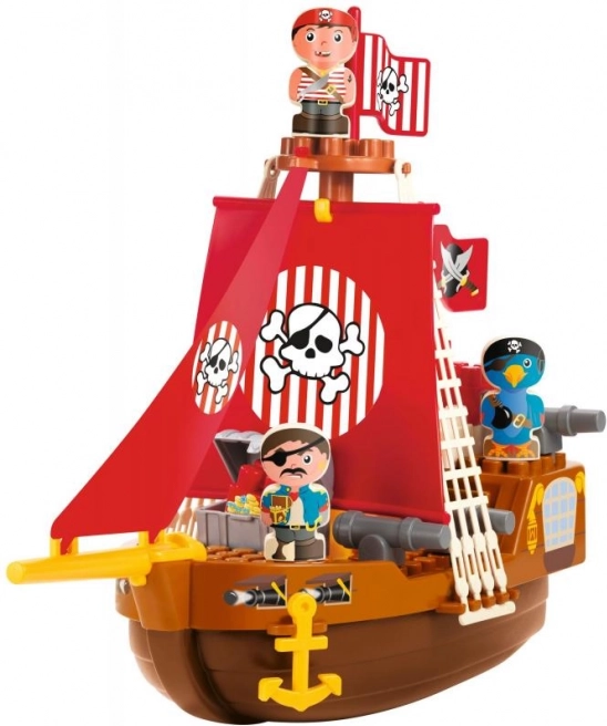 Het schip is uitgerust met gedetailleerde onderdelen, zoals rode zeilen met een schedel- en gekruiste-bottenmotief, die kinderen een authentieke piratenervaring bieden.