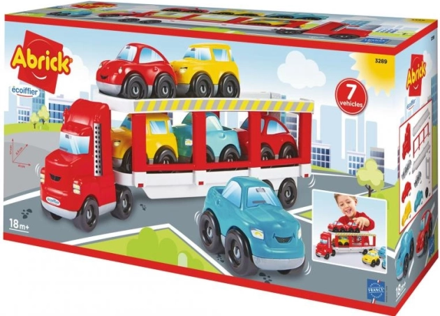 Aantrekkelijke Abrick transporter voor het vervoeren van autootjes! De transporter is uitgerust met een opklapbare oprit die eenvoudig laden en lossen van zes kleurrijke autootjes mogelijk maakt.