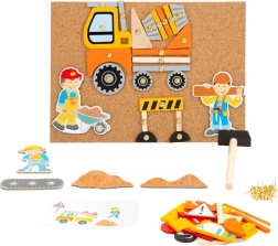 Het kurkbord met punaises maakt herhaaldelijk samenstellen en herschikken van verkeers- en bouwscènes mogelijk, precies zoals kinderen het bedenken.