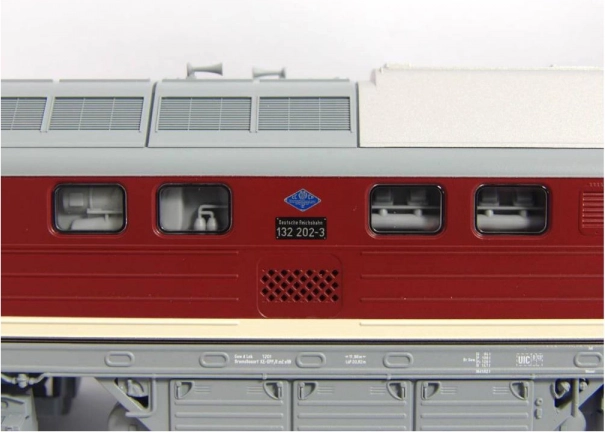 Getrouwe en gedetailleerde modelweergave van de dieselelektrische locomotief BR 132 „Ludmilla“ in DR-uitvoering. Opvallend zijn vooral de details die afwijken van andere varianten, zoals de handgrepen aan de frontzijde, de details van de front- en zijruiten en de uitvoering van het dak. De kleurstelling en bedrukking, inclusief alle decoratieve elementen, zijn van topkwaliteit, passend bij de Expert-productlijn. Het model is uitgerust met een krachtige motor met vliegwielen; het koppel wordt via diagonaal geplaatste, gebandeerde wielen op de binnenste assen van het draaistel overgebracht, waarbij vier assen worden aangedreven. In combinatie met het lange zinkdrukgietframe levert dit uitstekende rijeigenschappen op. Wit/rood LED-frontsein wisselt met de rijrichting en ook de machinistencabine is verlicht. Het model kan worden uitgebreid met een speciaal daarvoor bestemde digitale decoder met soundmodule en luidspreker. Er zijn ook passende rijtuigen/wagons van het juiste type en in bijpassende uitvoering verkrijgbaar. Belangrijkste kenmerken: zes assen motor met twee vliegwielen twee gebandeerde aangedreven wielen verlichting met kleurwissel volgens rijrichting interieurverlichting PluX22-interface volgens NEM 658 NEM 362-koppelschacht met kortkoppelingkinematica Documentatie: Brochure voor modellen BR 132/BR 232 (DE) Algemene informatie over BR 130 (DE, EN, F, NL) Testrapport van het model in Miniaturbahnen 2/2018 (DE) Handleiding en onderdelenlijst model nr. 52760 (DE, EN, F, NL)