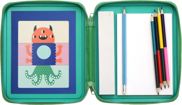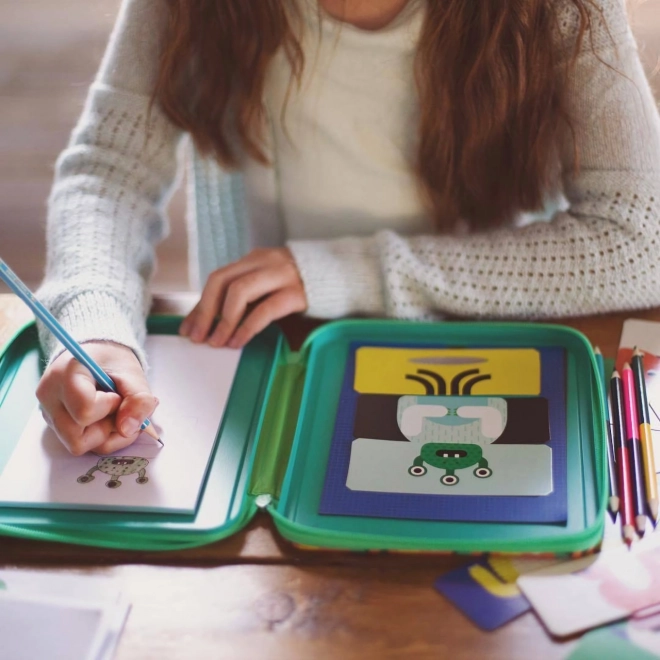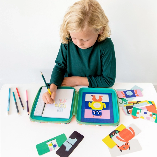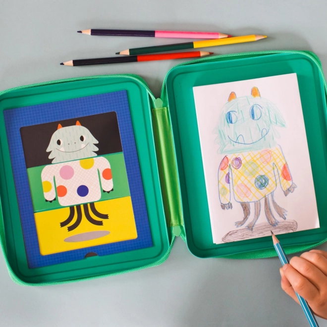 Creatieve set Monsters van Petit Collage is ideaal voor kleine kunstenaars. Bevat kaartjes en potloden om originele monsters te maken, verpakt in een compact magnetisch etui.