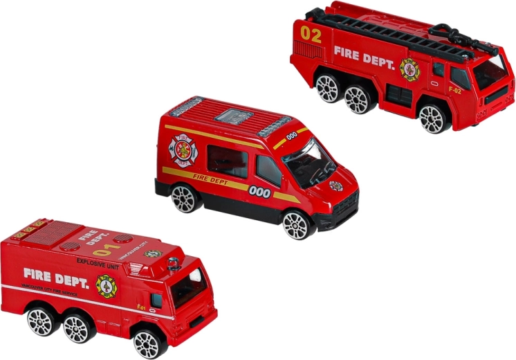 - 3 rode brandweerauto’s: ladderwagen, gepantserde transportwagen, stadswagen