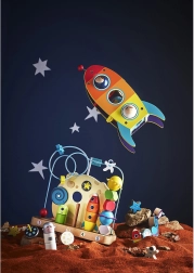 Ontdek de geheimen van de ruimte met dit geweldige houten rijgspeelgoed. Kleine handen zullen genieten van het avontuur van het rijgen van kralen aan een textielkoord, wat helpt bij de ontwikkeling van fijne motoriek en oog-handcoördinatie.