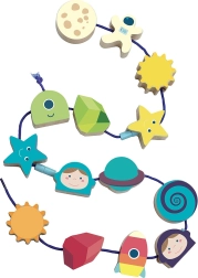 Prachtige ruimte rijgspeelgoed, geweldig voor de ontwikkeling van fijne motoriek bij kinderen. Bevat 14 prachtig geïllustreerde houten kralen zoals astronaut, maan, zon en raket.