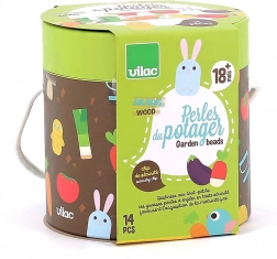 De set met 14 geïllustreerde kralen (bijv. aubergine, tomaat, vogeltje, laarzen) prikkelt de fantasie en helpt bij het leren van kleuren en benoemen.