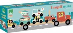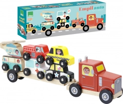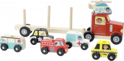 Een kleurrijke houten set met vrachtwagen en aanhanger brengt uren creatieve pret voor kinderen vanaf 2 jaar. Op de lange aanhanger kunnen 6 voertuigen worden geplaatst – taxi, politieauto, brandweerauto, ambulance, helikopter en minibus. Het speelgoed is gemaakt van kwalitatief hout en metaal, heeft een gladde afwerking en stimuleert de fijne motoriek, oog-handcoördinatie en fantasie. Het design is gemaakt door de gerenommeerde illustratrice Ingela P. Arrhenius.