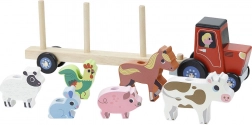 De vrolijke houten tractor van VILAC met afneembare aanhanger en zes schattige dieren (konijn, schaap, haan, paard, varken, koe) is het ideale speelgoed voor kinderen vanaf 2 jaar. Door de figuurtjes te plaatsen en met de aanhanger te rijden, trainen kinderen hun oog-handcoördinatie, geduld en fantasie.