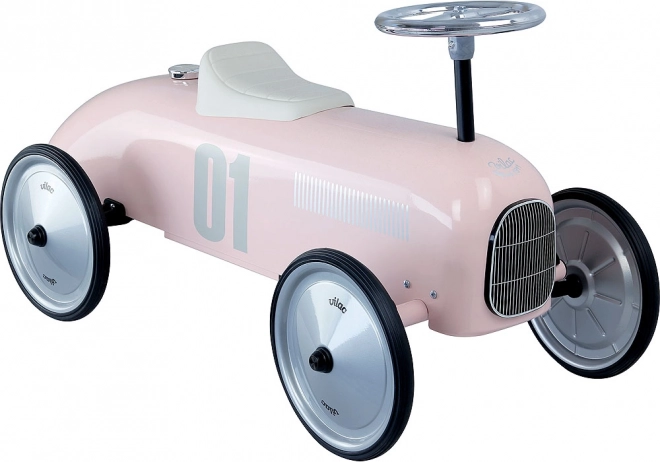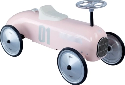 De roze loopfiets is geïnspireerd op klassieke raceauto's en geeft kinderen het gevoel van een echte coureur.
