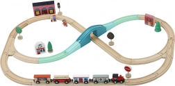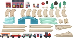 - 40 onderdelen: locomotief, 4 wagons, 24 raildelen, station, huizen, bomen, verkeersborden