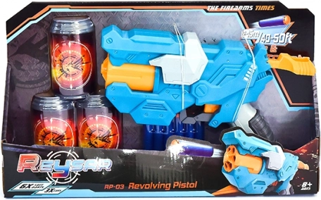 De set bevat drie plastic blikjes die dienen als doelwitten voor het oefenen van het richten, en zes zachte schuimkogels voor veilig spelen. Een perfecte keuze voor thuiswedstrijden in precisie en voor actiespelletjes met teamgenoten.