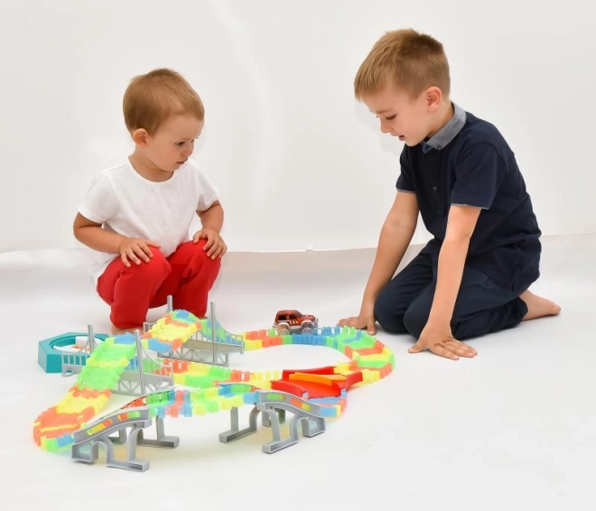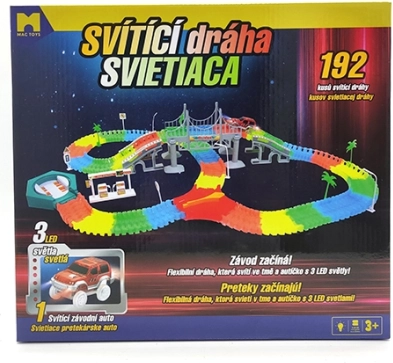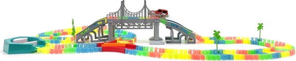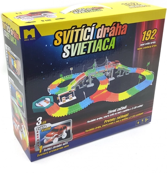 Lichtgevende racebaan met 192 delen, autootje en accessoires. De baan is flexibel en kan in elke gewenste vorm worden gebouwd. Wees creatief en bouw de baan zoals jij wilt. De baan licht op in het donker.