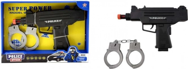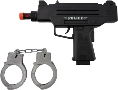 Leuke set met politie-uitrusting voor kinderen, bestaande uit een politiepistool en handboeien. Ideaal om politie te spelen, de fantasie te prikkelen en voor rollenspellen thuis en buiten.
