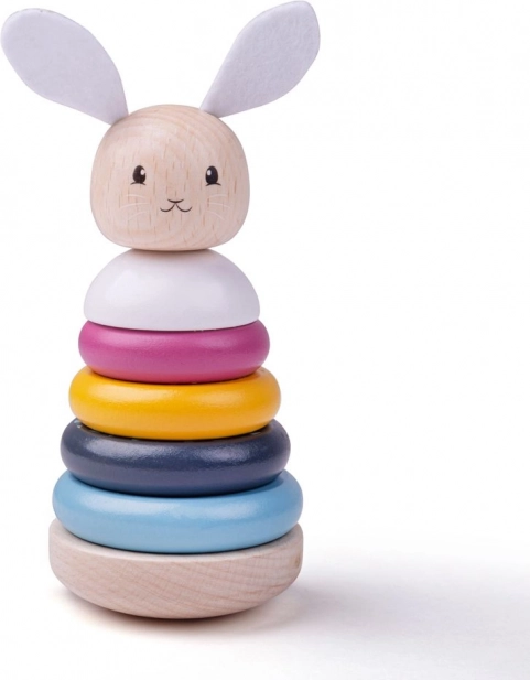 Deze hoogwaardige houten stapelaar in pasteltinten is een ideale eerste educatieve speelgoedset. Kinderen stapelen de ringen van groot naar klein, versterken hun oog-handcoördinatie en leren kleuren en vormen onderscheiden. De stoffen oortjes en staart van het konijntje voegen een tactiele dimensie toe aan het spel.