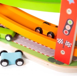 De houten baan biedt meervoudige niveaus in levendige kleuren zoals blauw, rood, geel en groen, die gegarandeerd de aandacht van ieder kind trekken.