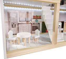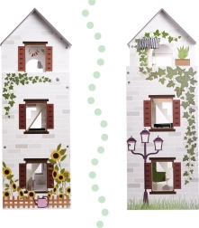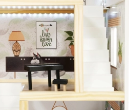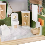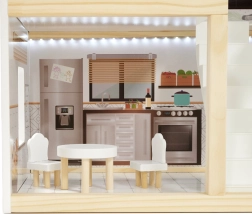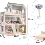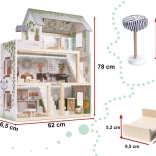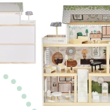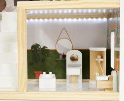 Het houten poppenhuis LULILO Floro is ontworpen in boho-stijl, wat het niet alleen mooi maar ook functioneel maakt. Met zijn drie verdiepingen en het ruime terras biedt het volop ruimte voor verschillende scènes en spelletjes. Het huis is uitgerust met vier kamers: keuken, badkamer, woonkamer en slaapkamer, waarbij elke kamer rijkelijk is ingericht zoals in een echt huis.