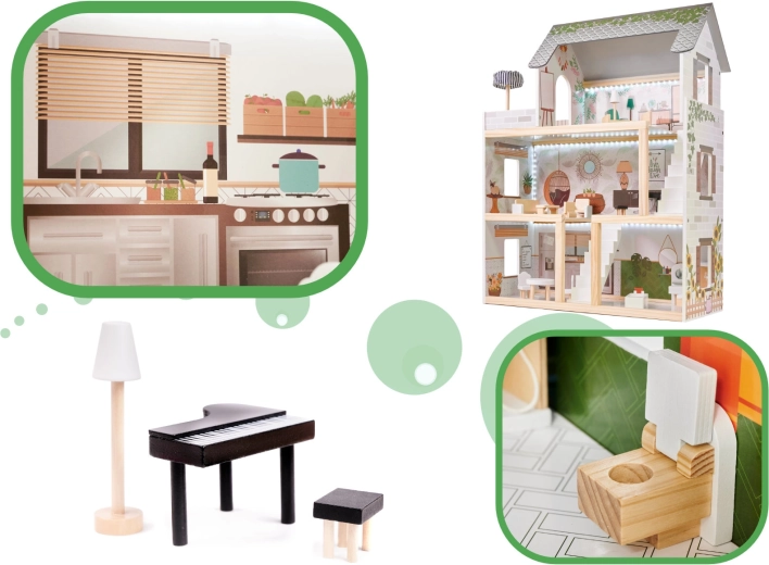 Ontdek de magische boho-wereld met het houten poppenhuis LULILO FLORO van 78 cm hoog. De driedelige constructie met terras, gedetailleerde accessoires en LED-verlichting creëert een gezellige sfeer voor urenlang creatief en fantasierijk spel. Zorgvuldig geschuurd hout, pasteltinten en een rijke uitrusting maken het tot een prachtige decoratie voor de kinderkamer en een perfect cadeau.