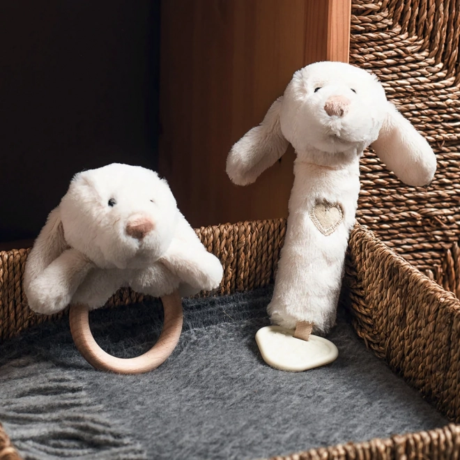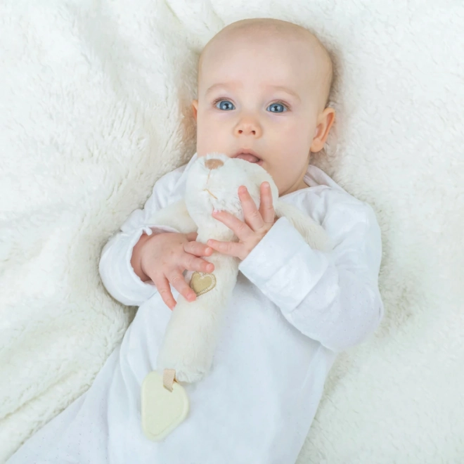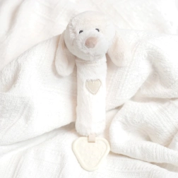 Dit veelzijdige, zachte hondje biedt kinderen drie ervaringen in één: zacht gerammel ter stimulatie van het gehoor, een leuke piep bij het indrukken en een getextureerde bijtring voor verlichting bij doorkomende tandjes. De neutrale natuurtint past in elke uitzet.