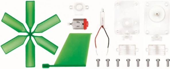 Bevat bladen, motor/generator, tandwielen en bevestigingsmateriaal. Kinderen oefenen basisassemblage en begrijpen het verband tussen beweging en elektriciteit.