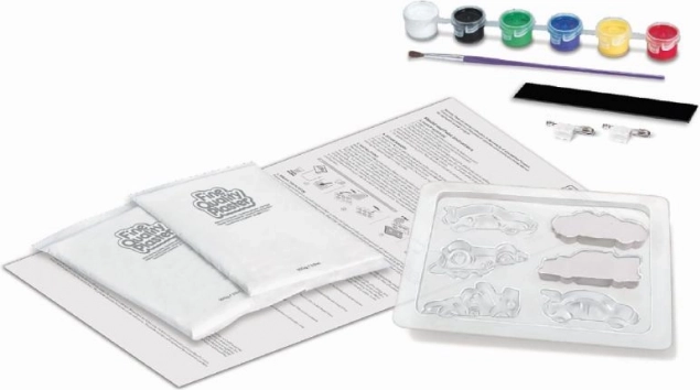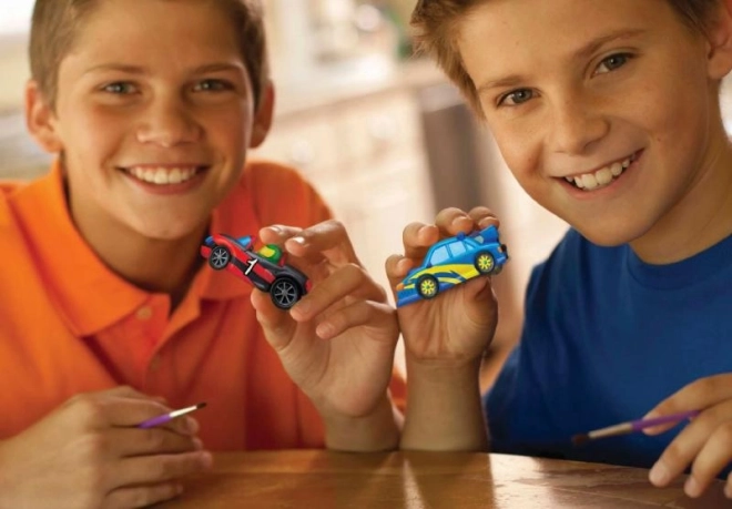 Deze set stelt kinderen in staat hun creativiteit te uiten en hun eigen raceauto's te maken met gips en verf.