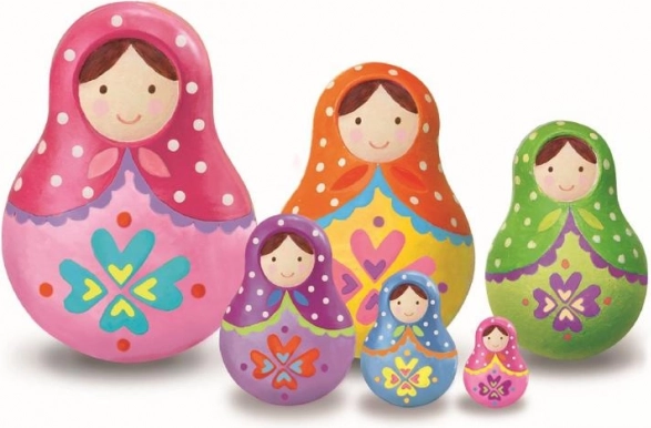Elk van de 6 houten poppetjes past stap voor stap in elkaar, zodat je een bonte set traditionele Russische poppetjes maakt met een moderne, persoonlijke stijl. Een geweldig idee voor een cadeau en een gezellige familie-activiteit.