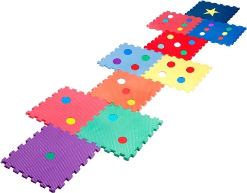 Levende kleuren en vormen (stipjes, ster) stimuleren de zintuigen en ondersteunen de ontwikkeling van fijne en grove motoriek. De foam dempt schokken en beschermt tegen kou van de vloer.
