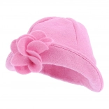 Zacht roze hoedje met een stijlvolle bloem completeert de outfit en beschermt het poppenhoofdje tijdens buitenspelen.