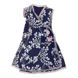 Donkerblauwe jurk met bloemendessin, V-hals, sierlijke bies en roze knoopjes geven de pop een speelse en elegante uitstraling.