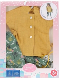 Groene broek met motieven van tropische planten en vogels geeft de pop een frisse en speelse look. De print past prachtig bij de okerkleurige blouse.