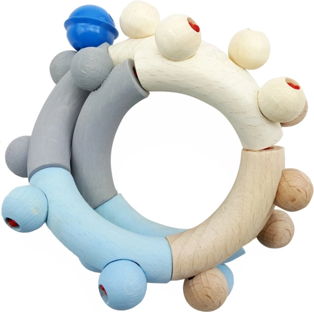 Hoogwaardig houten rammelaar, ideaal om de verbeelding te stimuleren en de fijne motoriek van je kind te ontwikkelen. Het rammelaar valt op door zijn pastelkleuren en is ethisch vervaardigd uit duurzaam beheerde bossen.