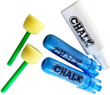 De set bevat 10 krijtjes, 2 houders, lettersjablonen, 2 sponsjes en een waterspuit. Alles wat je nodig hebt voor leuk en creatief tekenen.