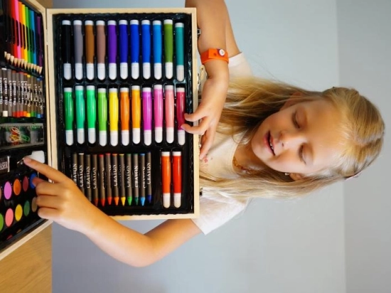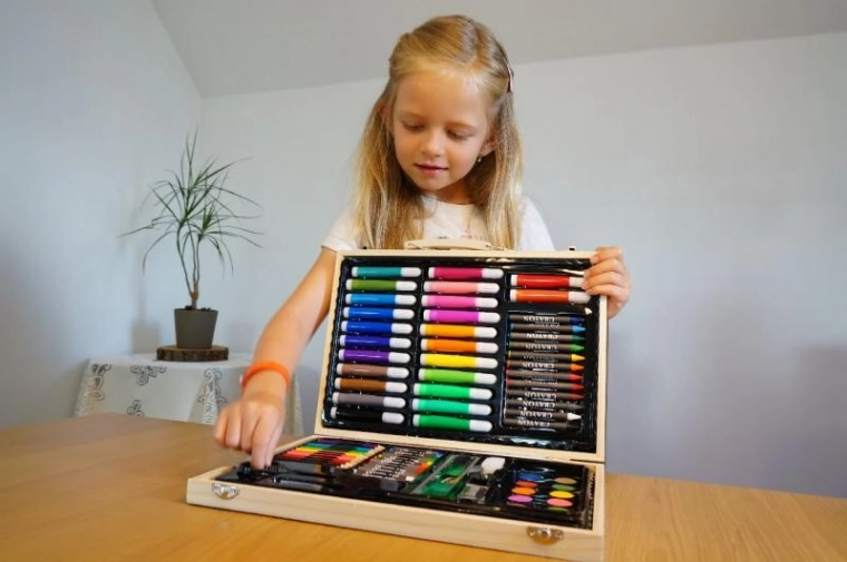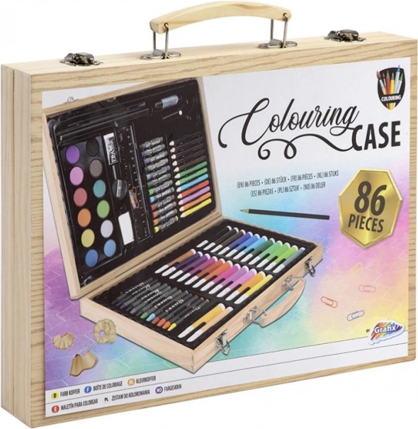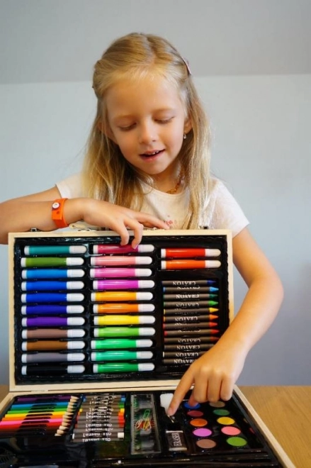 Houten kunstkoffertje dat alle schilders en creatieve mensen zal verrukken. Het koffertje bevat 86 stuks: viltstiften, kleurpotloden, waterverf, waskrijtjes, potloden, liniaal, gum...