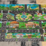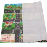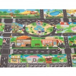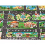 De mat toont een stedelijk landschap met wegen, gebouwen en parken, wat de verbeelding en creativiteit van kinderen stimuleert tijdens het spelen met speelgoed.