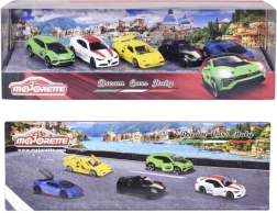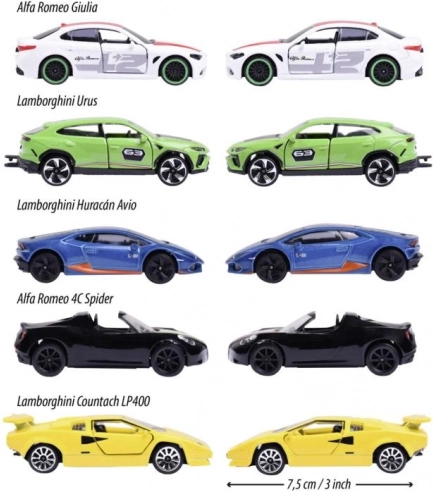 In de verpakking vindt u een selectie legendarische voertuigen: ALFA ROMEO 4C Spider, LAMBORGHINI Countach LP 400, LAMBORGHINI Huracán Avio, LAMBORGHINI Urus en ALFA ROMEO Giulia. Dankzij de scharnierende delen en de functionele vering is de rit soepel en realistisch. Perfect voor kinderen vanaf 3 jaar en als stijlvolle aanvulling op een verzameling.
