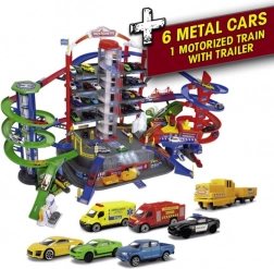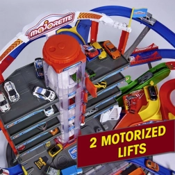De grote speelgarage met een breedte van bijna 1,30 m is het grootste nieuwe product in de wereld van Majorette! De garage bestaat uit zeven speeloppervlakken en heeft tot wel 35 parkeer- en opslagplaatsen. Het hart van het station is een gemotoriseerde spiraallift die tegelijk tot negen metalen autootjes kan vervoeren. Eenmaal boven verdelen automatische wissels de voertuigen over vier verschillende rijstroken. Zes verschillende licht- en geluidseffecten, evenals talloze speelelementen zoals een treinstation, een tankstation met benzinepomp, een autowerkplaats en wasstraat, een brandweerkazerne, een politiebureau met geheime schuilplaats en een helihaven, zorgen voor eindeloos speelplezier. Inclusief 6 metalen autootjes, een batterij-aangedreven trein, automatische wissels, een tunnel met crashfunctie en 2 gemotoriseerde liften. Helikopter niet inbegrepen. Afmetingen na montage: 128 x 78 x 73 cm.