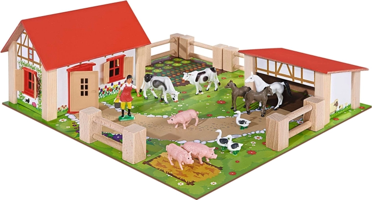 De EICHHORN houten boerderij zal elke kleine boer of boerin verheugen. De set bevat een huisje met rood dak, een stal, hekken en gedetailleerde dierenfiguren, waaronder paarden, koeien, biggetjes en ganzen. Er is ook een kleurrijke mat met wegen en een tuintje die kinderen gemakkelijk aanzet tot het maken van eigen scènes en verhalen. De solide houten constructie en duurzame materialen zorgen voor een lange levensduur en veilig spel.