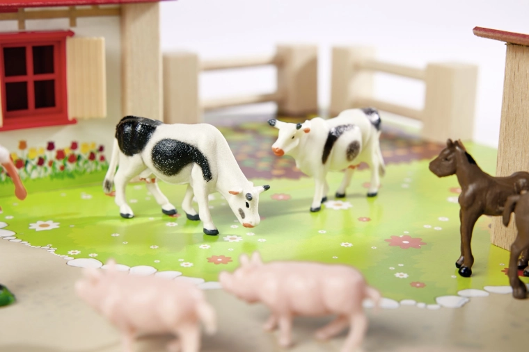 De mat met wegen, gras en moestuin en koppelbare hekken maken het eenvoudig om weides te bouwen en eigen boerderijverhalen te creëren.