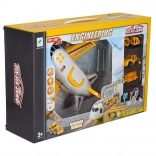 Bouw een complete bouwplaats en vervoer de machines rechtstreeks naar de locatie! Het robuuste vliegtuig met uitklapbare achterklep en zijopening maakt gemakkelijk laden en hanteren van de voertuigen mogelijk. Bij het indrukken van de knoppen gaan knipperende LED’s op de vleugels en onder de cockpit branden en starten realistische geluidsignalen.