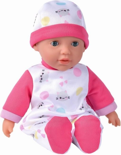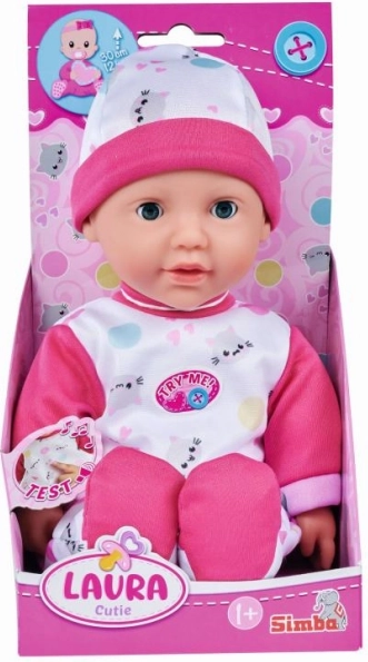 De interactieve pop Laura is ideaal voor jonge meisjes die vader- of moedertje willen spelen of als verzorger willen oefenen. Ze draagt een schattige outfit met katjes en polkadots die eenvoudig kan worden uitgetrokken. Laura maakt vijf vrolijke geluiden die starten wanneer je op haar buikje drukt, waardoor het spel nog leuker wordt.
