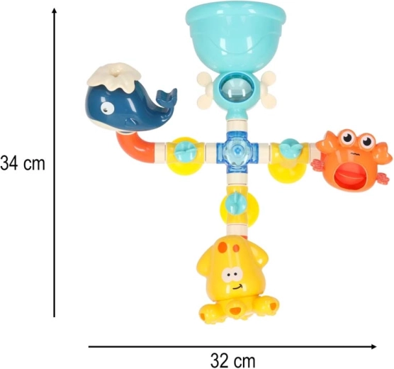 Deze kleurrijke waterbaan voor in bad bestaat uit trechters, buizen en vrolijke uitlopen in de vorm van een walvis, krab en octopus. Kinderen gieten eenvoudig water van boven en zien hoe het door het systeem stroomt, wieltjes laat draaien en uit verschillende openingen stroomt als een fontein of waterval. Veilige materialen en afgeronde randen zijn ideaal voor dagelijks waterspel.
