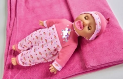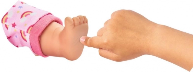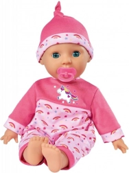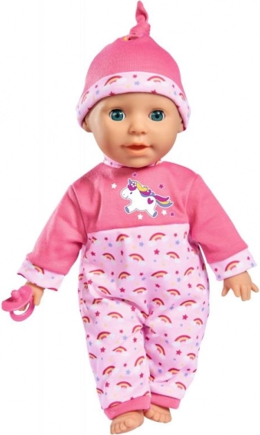 Deze pop wordt geleverd in een prachtige roze outfit met een eenhoorn en regenboogmotieven, wat elk kind zeker zal verrukken.