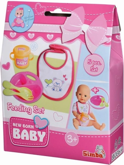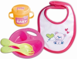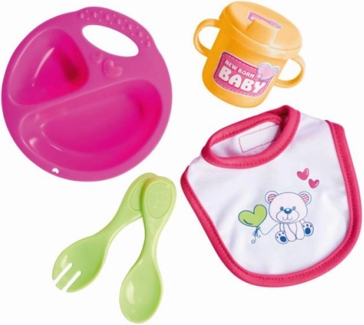 Schattig eetservies voor poppen NEW BORN BABY bevat 5 delen – bord, lepeltje, vorkje, bekertje en slabbetje – voor poppen van 30–43 cm. De set is licht en makkelijk afwasbaar, ideaal voor voerspelletjes en het ontwikkelen van de fijne motoriek.