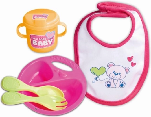 Bord, lepeltje, vorkje, bekertje met oortjes en een stoffen slabbetje – alles in één verpakking voor het realistisch voeden van de pop.