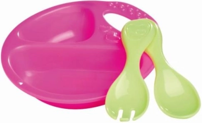 Lichtgewicht plastic servies met afgeronde vormen en ergonomisch bestek ondersteunt zelfstandig spelen en de fijne motoriek.