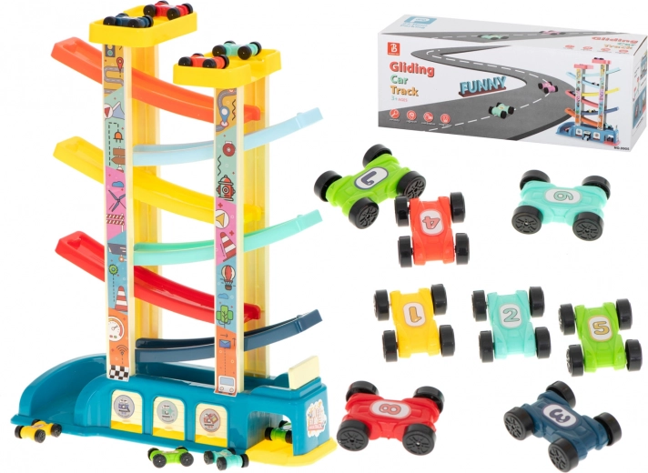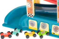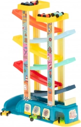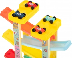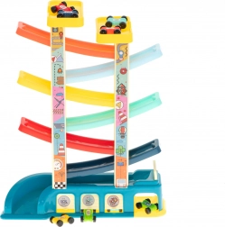 Klaar voor de start? Af! Welk van de bonte autootjes komt als eerste over de finish? De meerlagige racebaan garandeert een actievolle afdaling met spectaculaire oversprongen tussen de verdiepingen en een vloeiende rit tot beneden. Starten kan vanaf twee niveaus – de bovenste of de tweede verdieping – voor elke keer een andere race-ervaring.