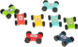 De set bevat acht gekleurde autootjes met nummers – ideaal voor samen racen, eerste tel-ervaringen en het onderscheiden van kleuren en vormen.